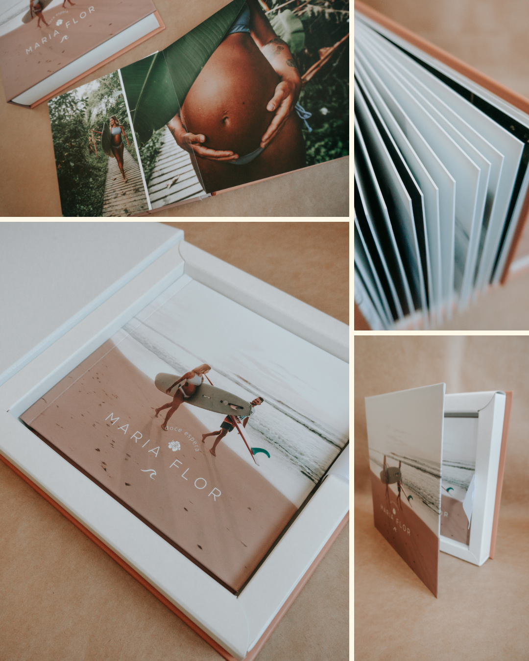 Ele tem o tamanho 20x20 cm, com 20 páginas e cabe em média 40 fotos, mas podemos colocar mais.